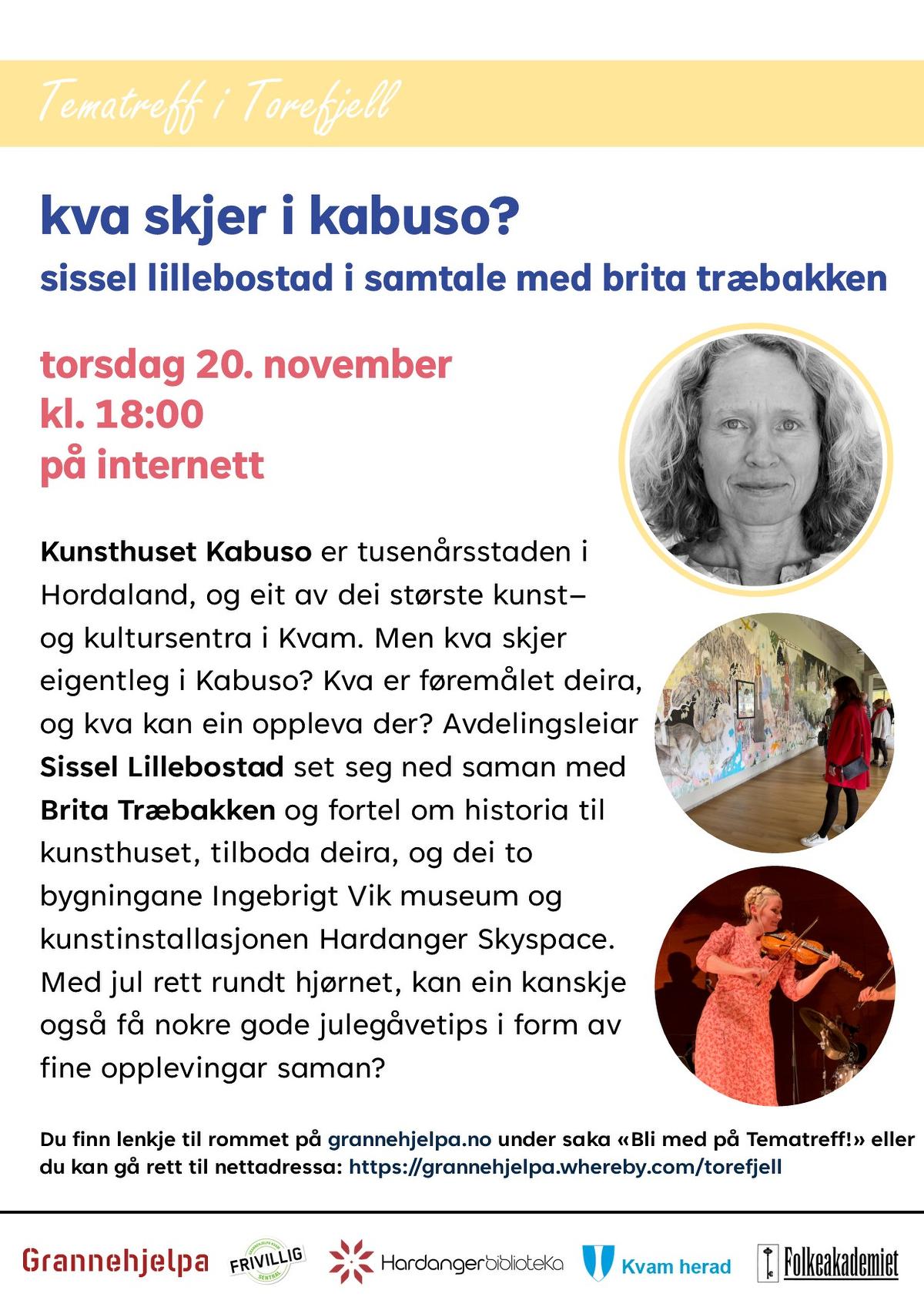 Torsdag 20. november: Kva skjer i Kabuso? Sissel Lillebostad i samtale med Brita Træbakken