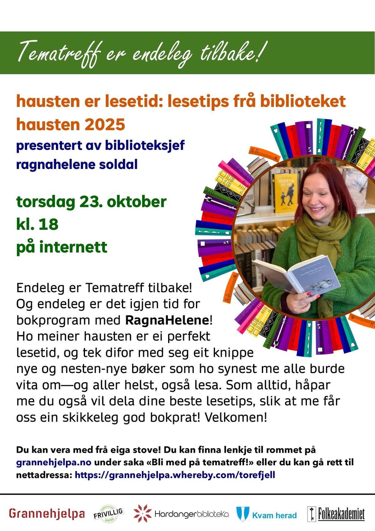 For å vera med på tematreff, klikkar du deg inn på denne lenkja: https://grannehjelpa.whereby.com/torefjell
